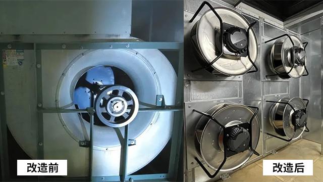 據(jù)了解,從前的寫字樓空調(diào)系統(tǒng)離心風(fēng)機(jī)都是采用的一臺(tái)帶變頻器的皮帶輪蝸殼離心風(fēng)機(jī),這種離心風(fēng)機(jī)不僅尺寸大、能耗高、噪音大、只具有兩檔的手動(dòng)調(diào)速、每年的定期停機(jī)維護(hù),而且一旦離心風(fēng)機(jī)發(fā)生故障,整層的空調(diào)系統(tǒng)將陷入癱瘓。